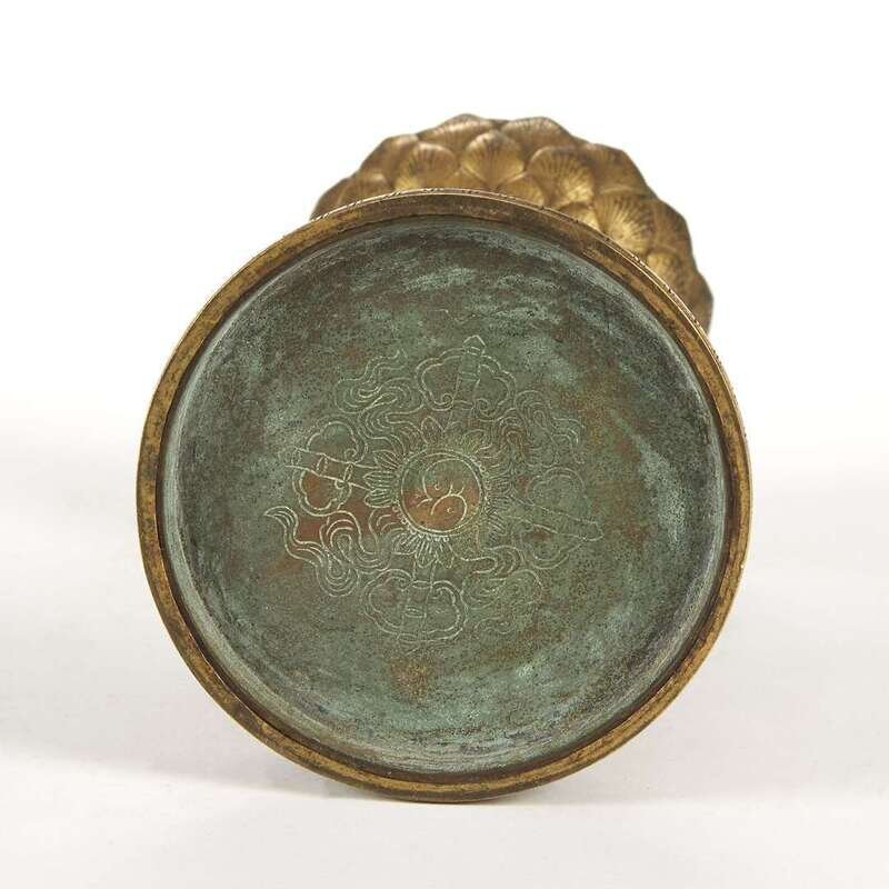 Finely cast and engraved in the form of a lotus, on scrolled supports and lotus petal base.