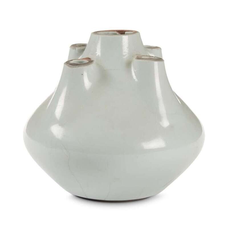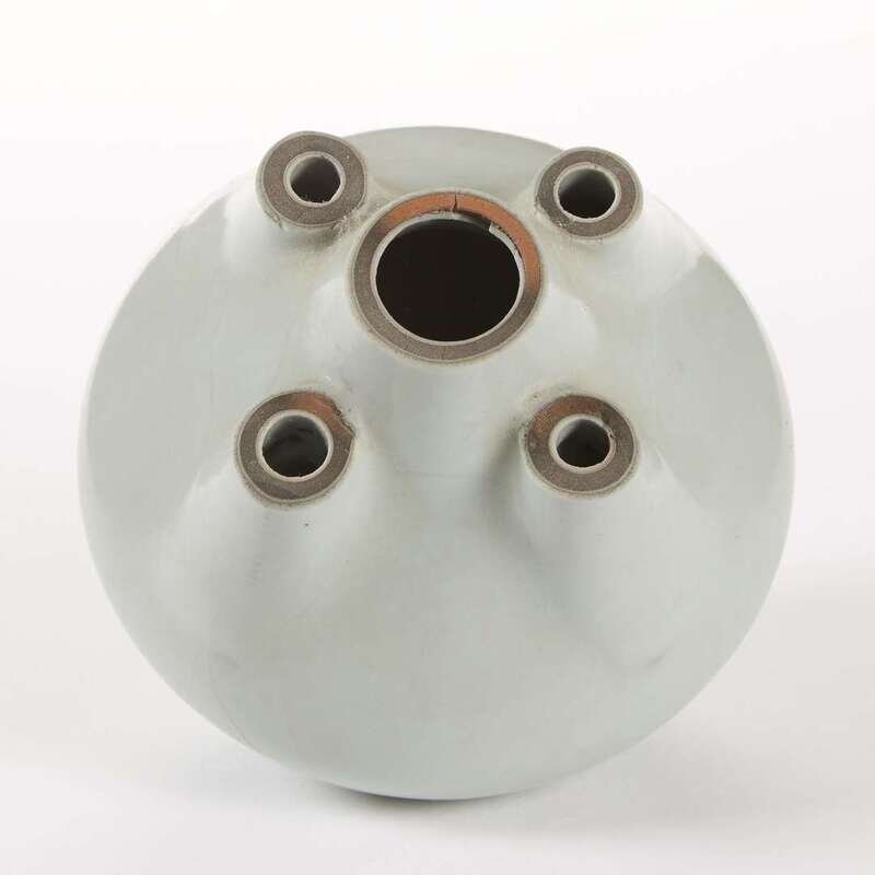 Elegantly potted with the compressed pear-shaped body rising from a low foot to four short tubular necks, centered by a fifth neck, with a thick, slightly crackled blue green glaze on a dark grey body.