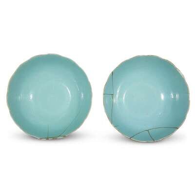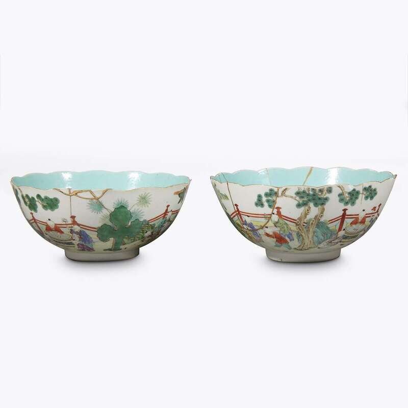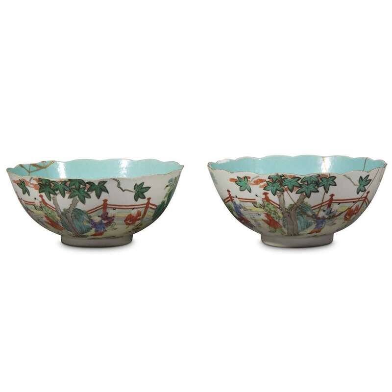 The hemispherical bowls with scalloped rim, on straight circular foot, depicting boys playing in a garden.