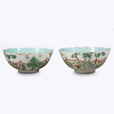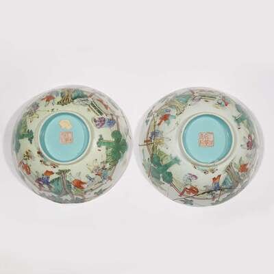 A matched pair of Chinese famille rose-decorated porcelain bowls Jiaqing six character seal mark and probably of the period