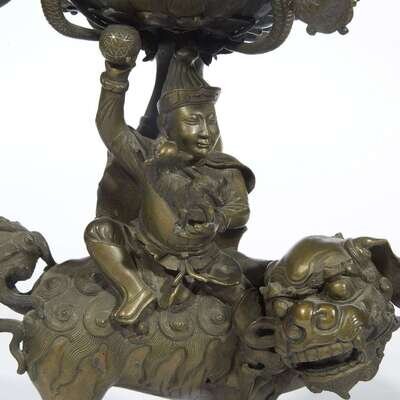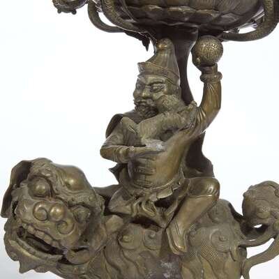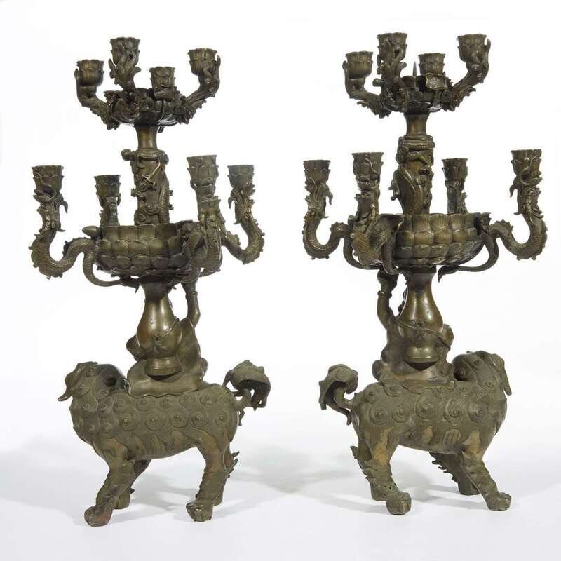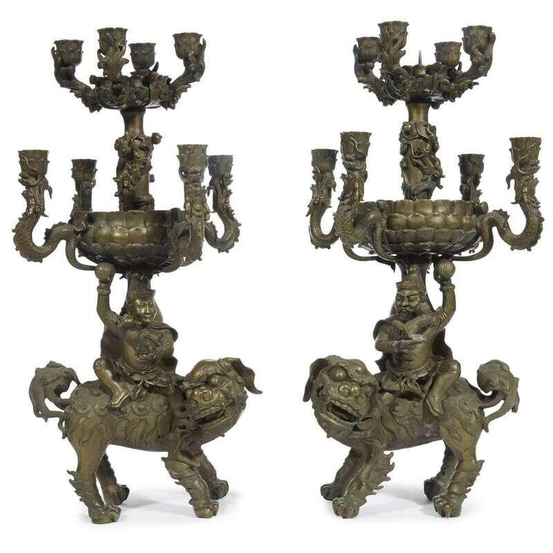 An unusual pair of bronze "Foreigner, Shishi and Dragons" candelabra