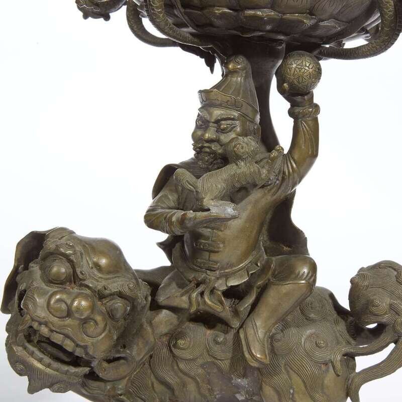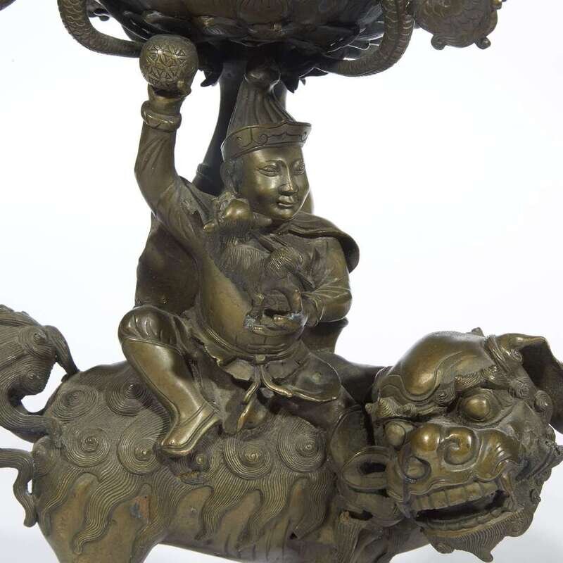 Bronze with a golden/olive brown patina, modeled with Buddhist lion bases straddled by men holding smaller lions and brocade balls, topped by two tiers of lotus platforms with four arms molded with dragons and lotus flowers to each tier, the center posts similarly molded with dragons, central prickets.