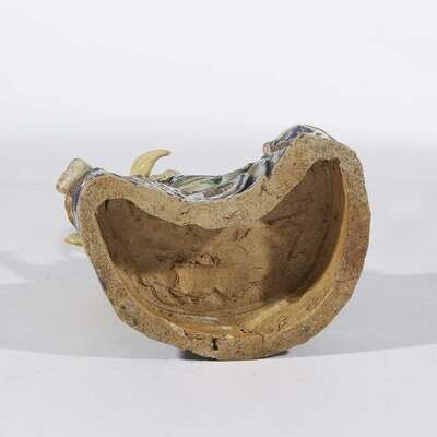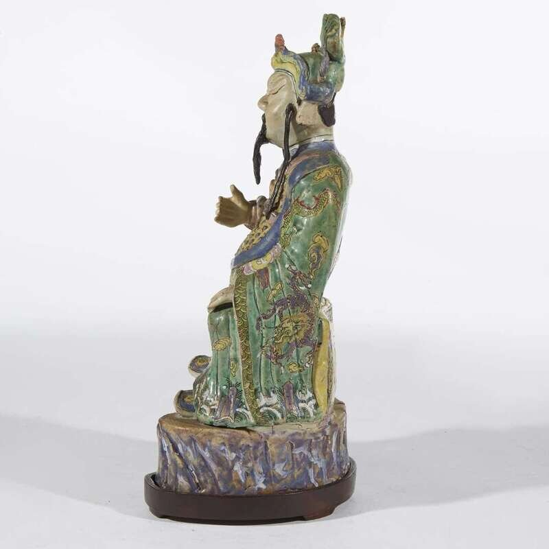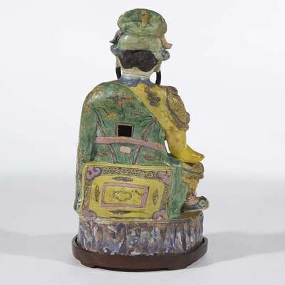 Seated with spread legs, wearing armor and a green robe with floral and dragons decoration, later wood base.