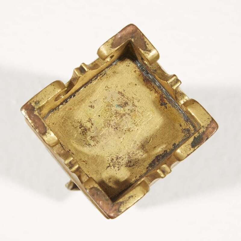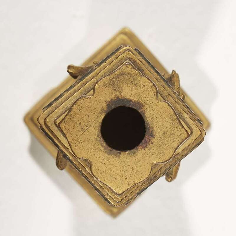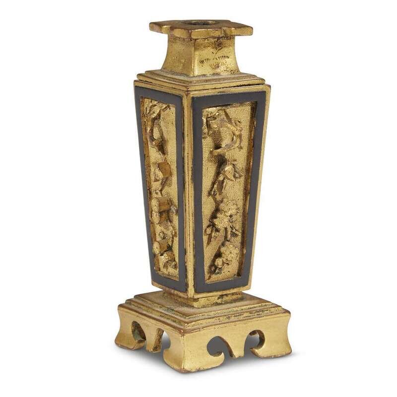 With four tapered sides, each with rectangular reserves cast in high relief with flowered branches and birds against stippled backgrounds, with a quatralobe mouth, raised on a platform base with scroll feet.