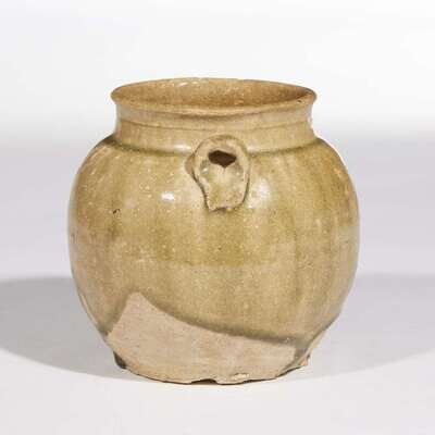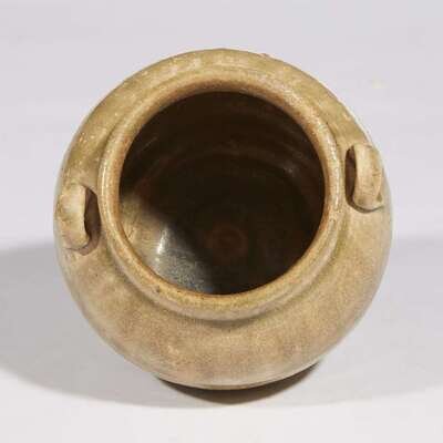 With an olive-green drip glaze and two loop handles on shoulder.