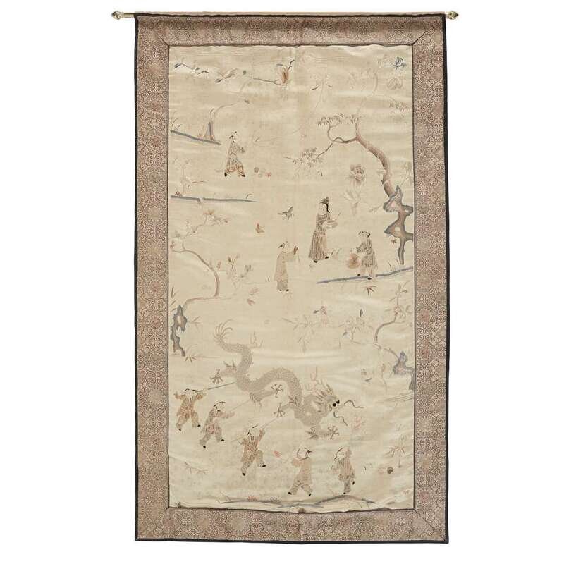 Depiciting boys at various pursuits, including flying kites, playing musical instruments, and performing a dragon dance with accompanying dragon puppet, with a floral-patterned border, later backing and metal curtain rod.