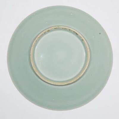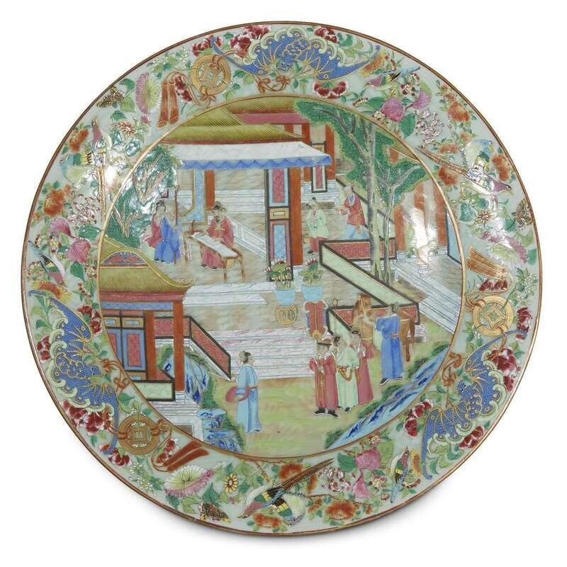 A Chinese export porcelain celadon-ground "Rose Mandarin" dish 19th century