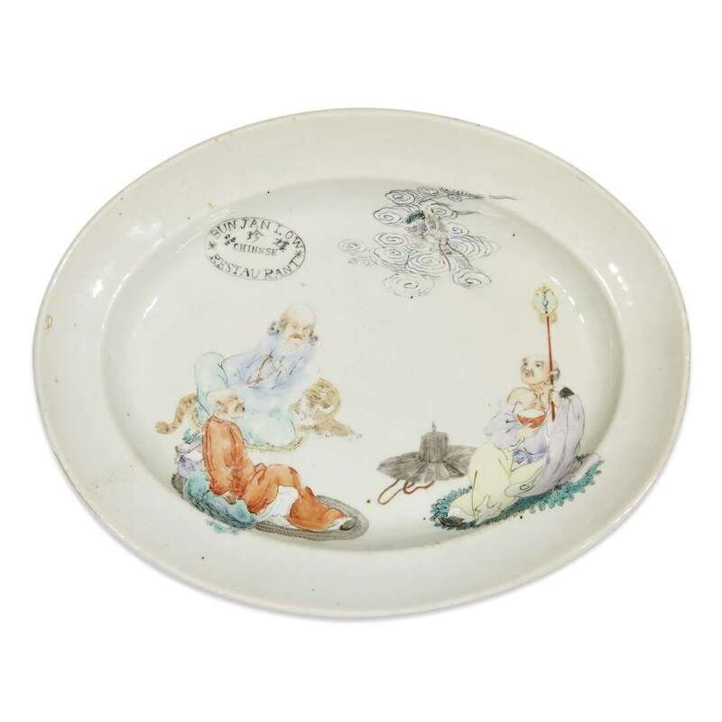 An unusual Chinese export porcelain "Bun Jan Low Restaurant" oval platter 19th/early 20th century