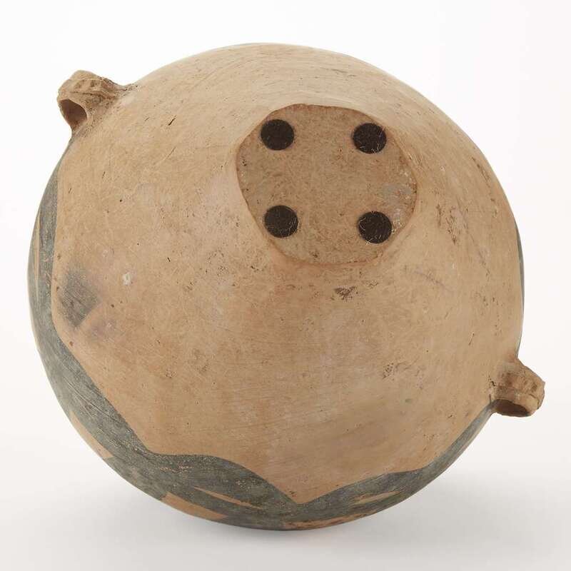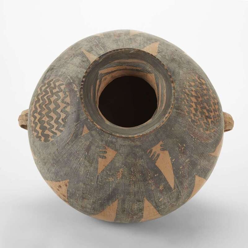 The globular jar with flared lip and two handles at the waist, decorated with linear and circular motifs.