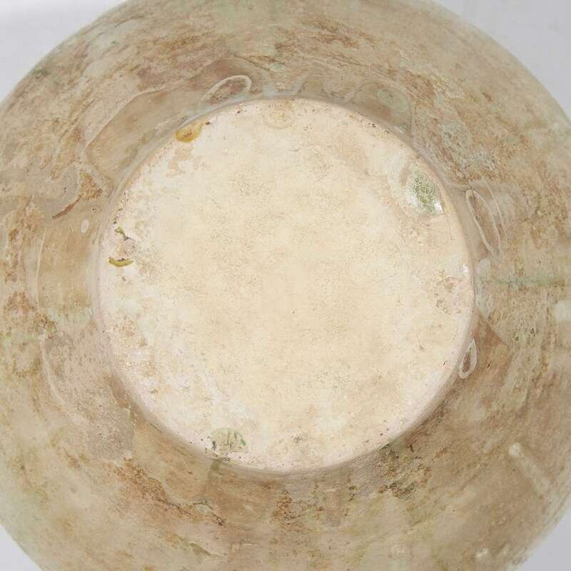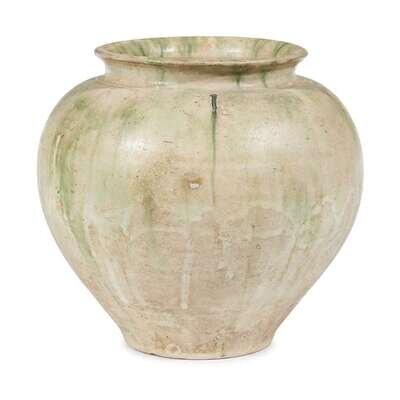 The ovoid body with flared lip and a slightly-spreading foot, all covered under a slightly iridized glaze of beige tone suffused with pale green patches.
