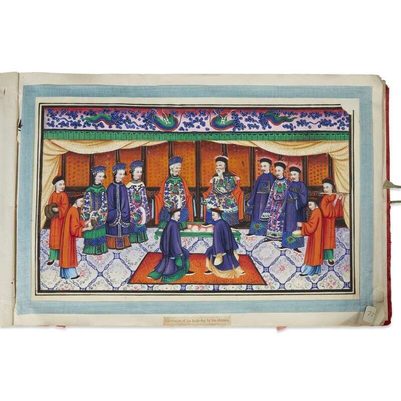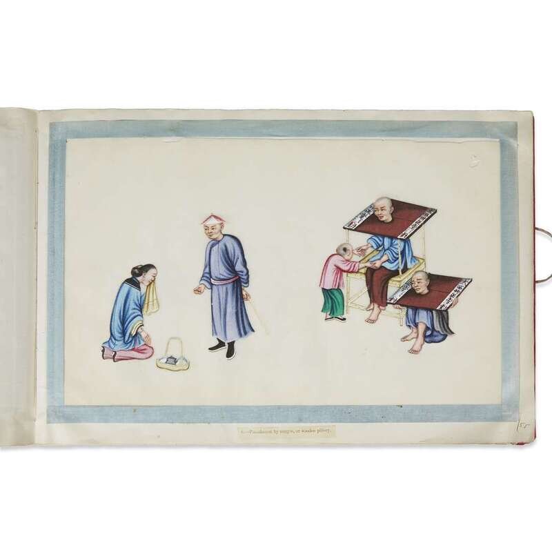 With label of the artist, located at No. 46, Wellington Street, the first album comprising 12 images with captions, depicting the life of a Mandarin from birth to death; the second album with 12 images depicting trial, torture and punishment of criminals, all edged with pale blue silk ribbon.