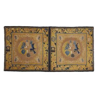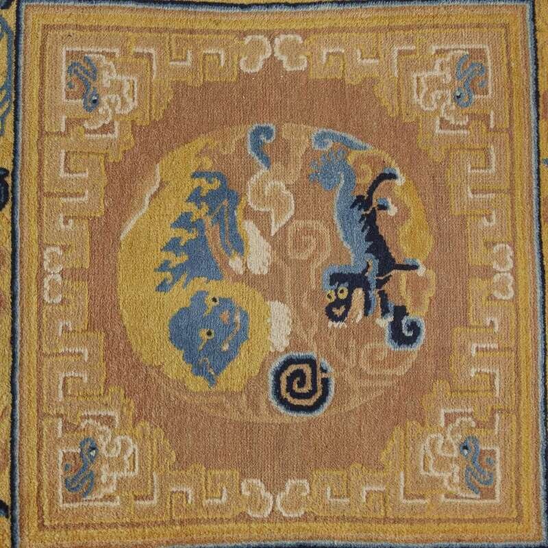 Mat with rectangular scroll patterns, foliate borders, and Buddhist lions to centers; the saddle blanket with a floral border and roundels to center.