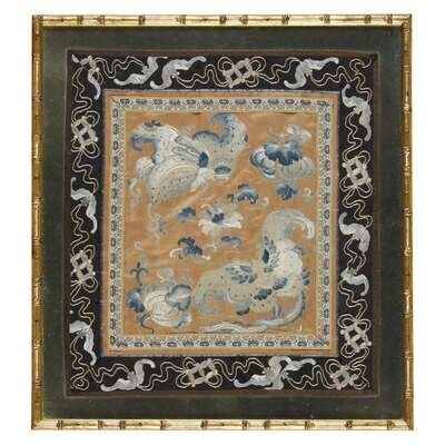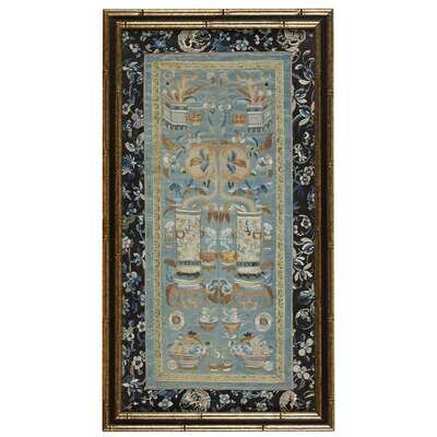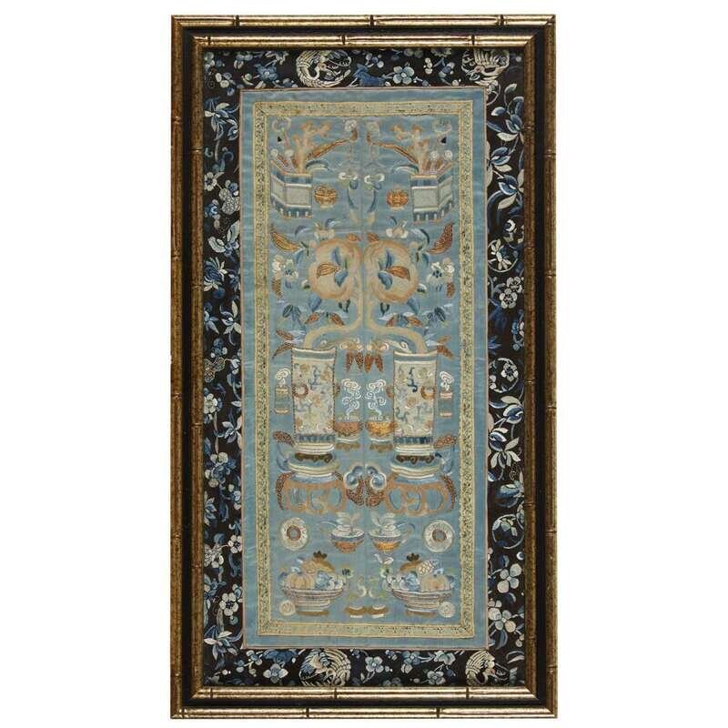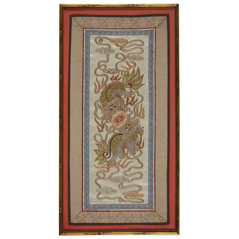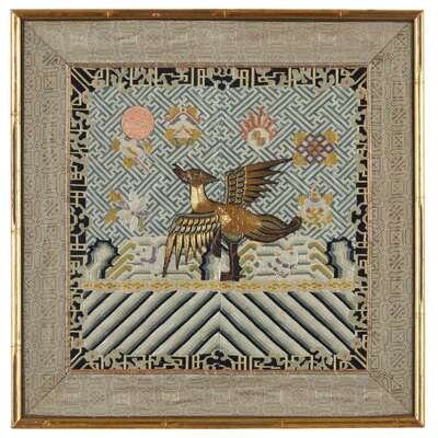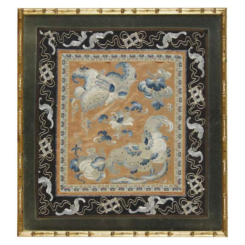 Comprising: a mandarin duck rank badge, a square panel with composite butterflies and melons, cash and bat borders; a rectangular panel with two shishi and a ball; and a rectangular panel with calligraphy instruments, vases, and peaches, crane and flower border. Framed, matted, and glazed.