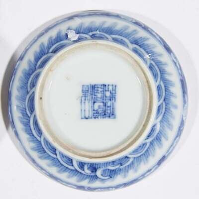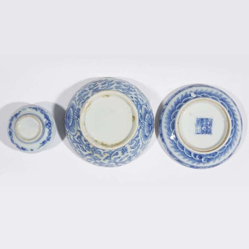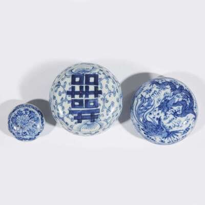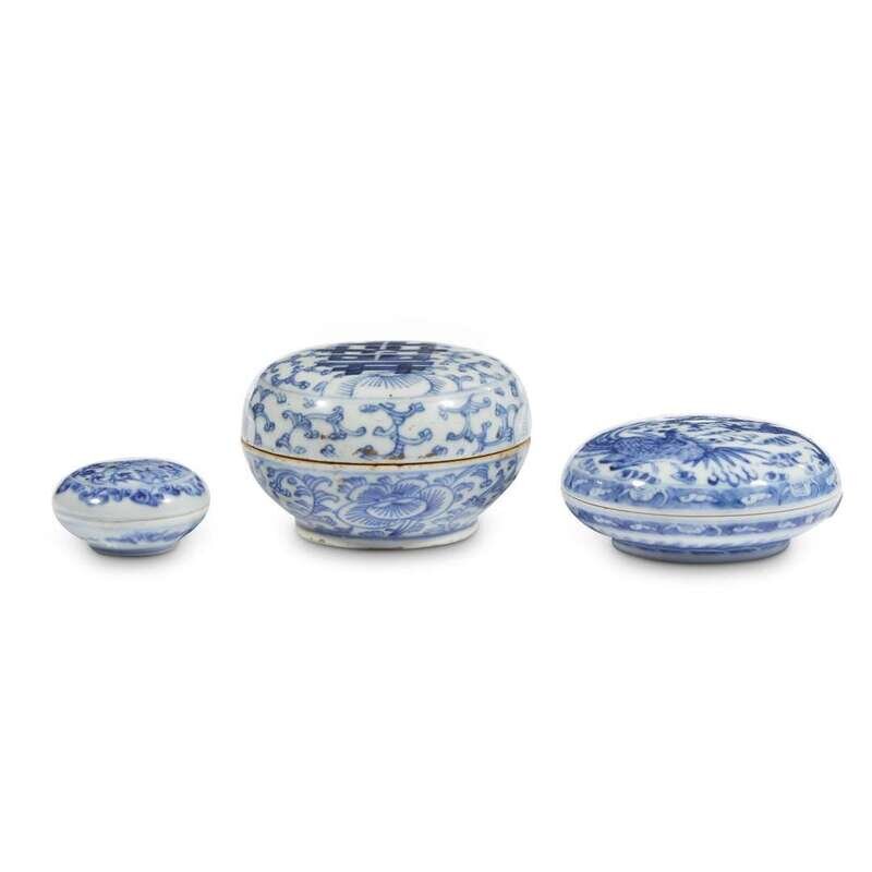 Comprising: a underglaze blue "double happiness" and floral-scroll box, 19th century; a "dragon and phoenix" box, 20th century, Qianlong mark underside; a small box from the "Hatcher Collection", circa 1640, decorated with composite floral scroll and scroll borders.