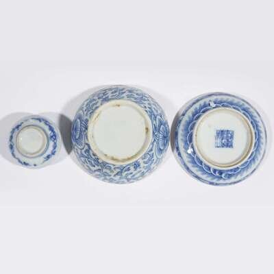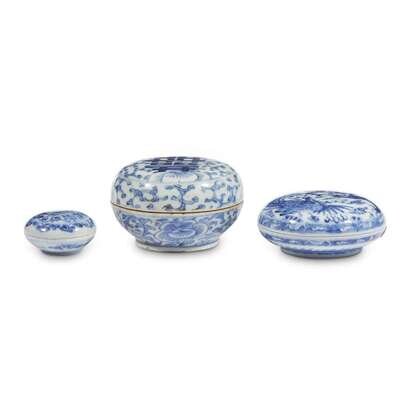 A group of three Chinese blue and white circular covered boxes 17th-20th century