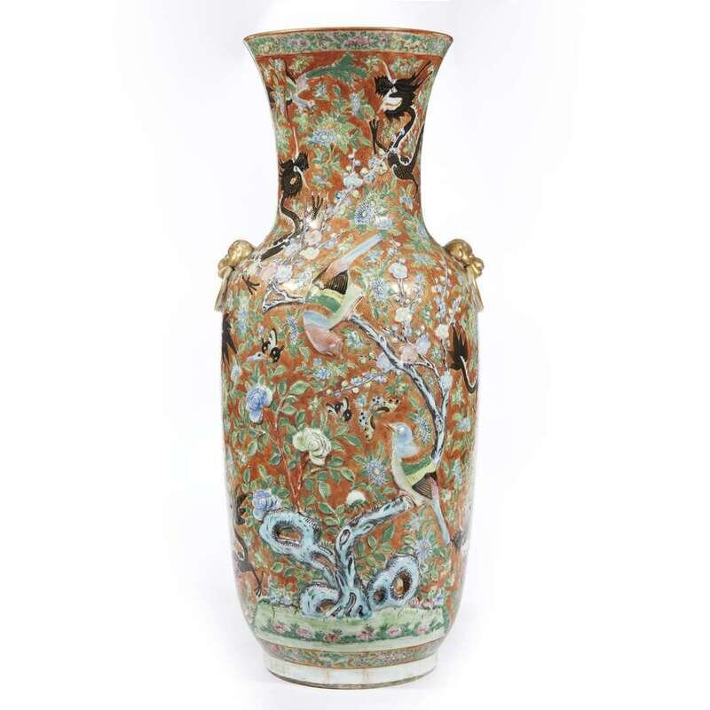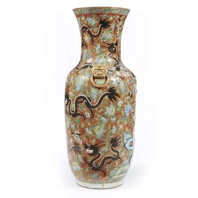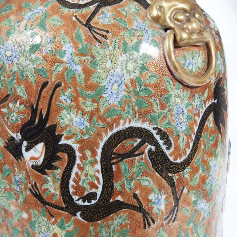 Molded on one side with birds on flowering branches, "Lion-head and ring" handles at the shoulder; decorated with seven black dragons among foral sprays against an orange ground.