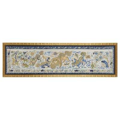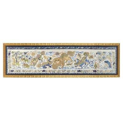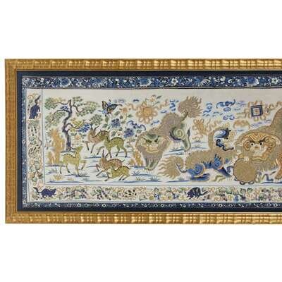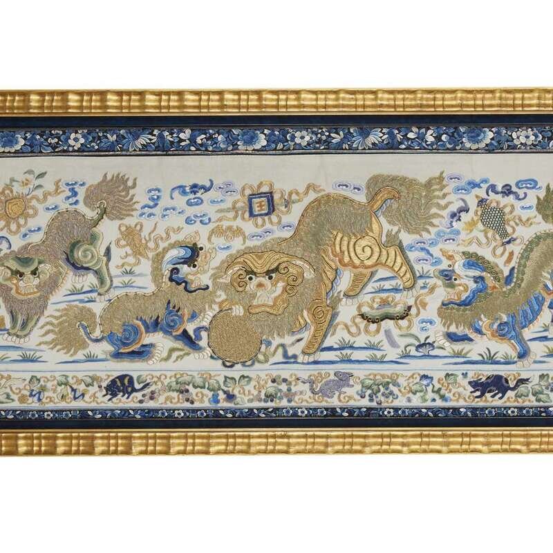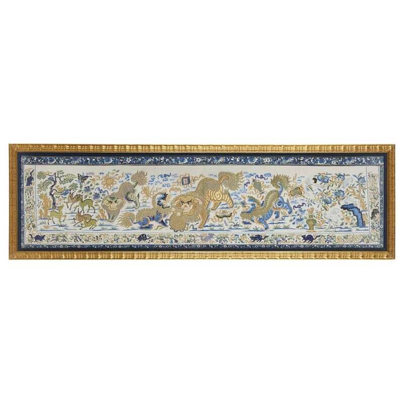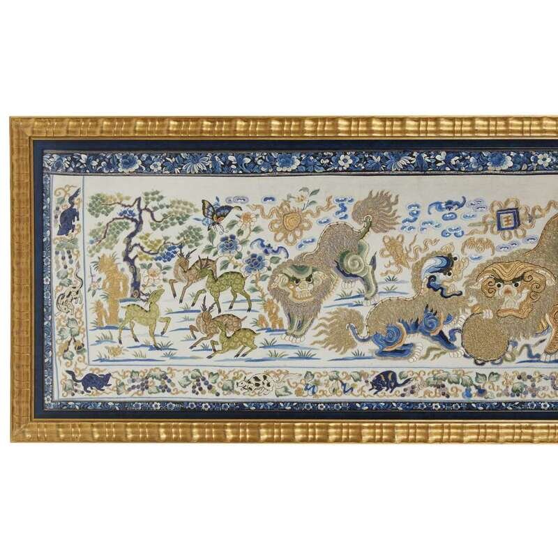 The rectangular panel finely embroidered with four gold and silk lions in satin stitch, depicted playing with a brocade ball, surrounded by auspicious symbols, cranes and deer, bordered at the sides and bottom with tree squirrels and fruiting vine, enclosed within a later band of blue and white flowers, framed and glazed. .