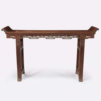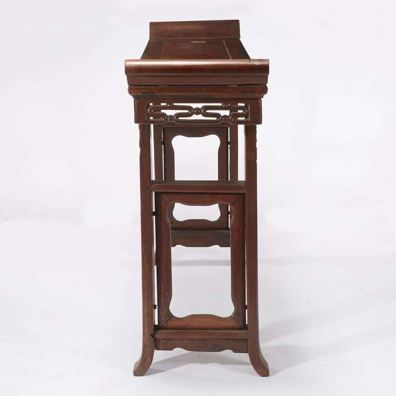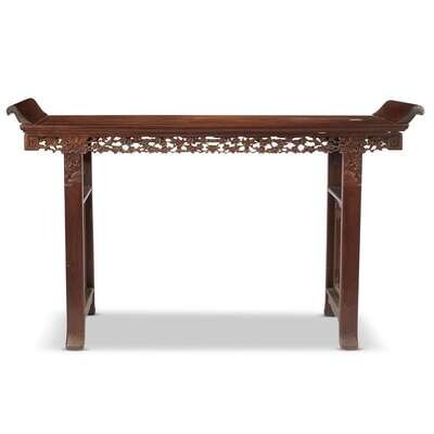 The rectangular top with scrolled panels at the ends and an inset central floating panel, raised on recessed open panel supports with flared feet, one side of skirt carved with birds among flowering cherry, the reverse and sides carved with pierced decorative fret motif.