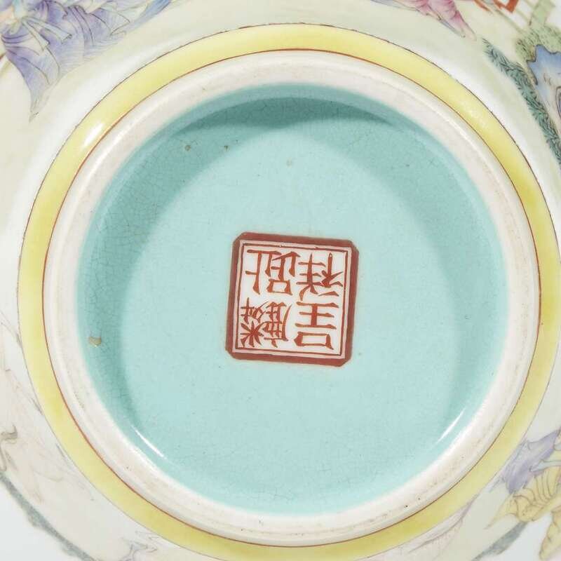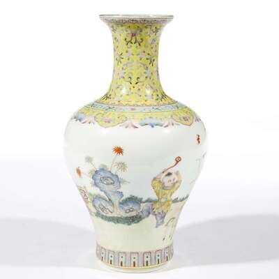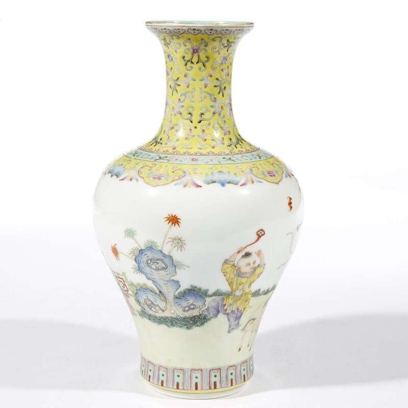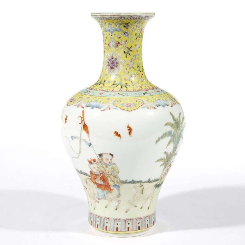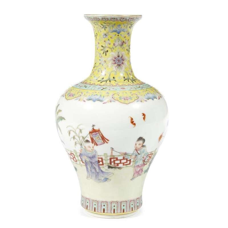 The baluster-shaped vase supported on a low foot and rising to a swelling shoulder and tall waisted neck, decorated with a continuous scene of five boys at play with three rams, each holding auspicious objects, in an elegant garden with ornamental rocks and flowering plants, all set below a ruyi-head and bat border, the shoulder and neck with scrolling lotus against a yellow ground, the lip gilt, the foot encircled by a pink-enameled lappet band, the base with a four-character iron-red seal mark "Lin Zhi Cheng Xiang"; turquoise interior. NOTE: For a related pair of covered jars, see those sold Sotheby's New York, September 17, 2013, lot 367, where there is a full discussion of the auspicious motifs displayed.