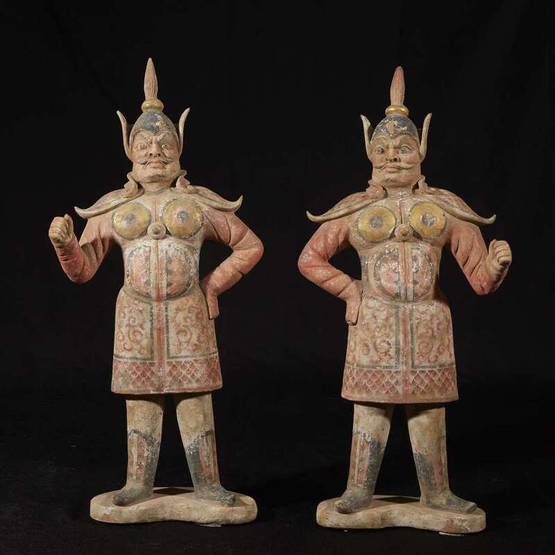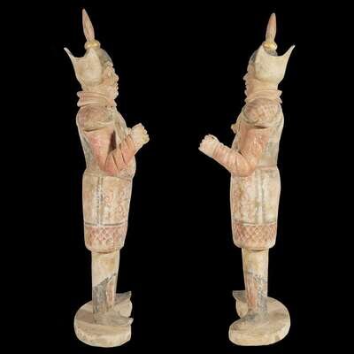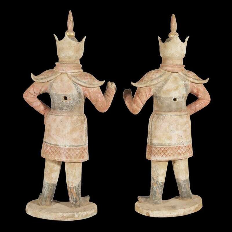 Each depicted in straightforward stance, one arm on hip; the other raised, dressed in elaborate armor and costume, retaining significant amounts of pigment. Accompanied by the results of Oxford Authentication thermoluminescence test #C102h10, for one of the figures, dated April 4, 2002, stating the results are consistant with the suggested age of manufacture.