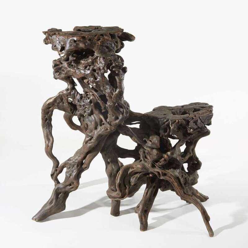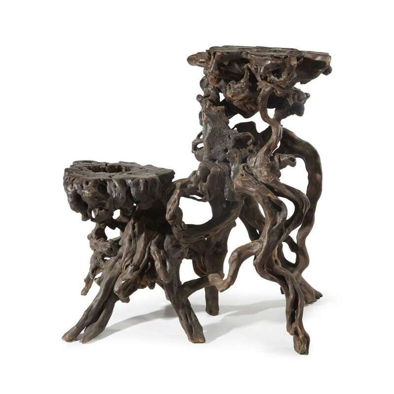 Of irregular, rustic form, with one upper and one lower tier, branching base, mottled rubbed brown finish.