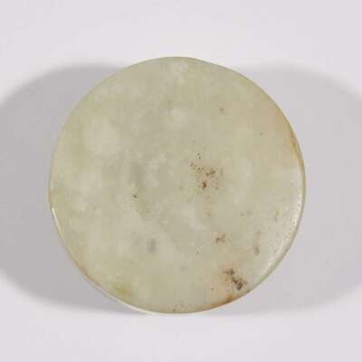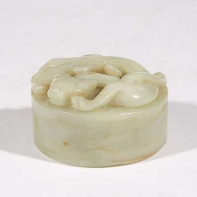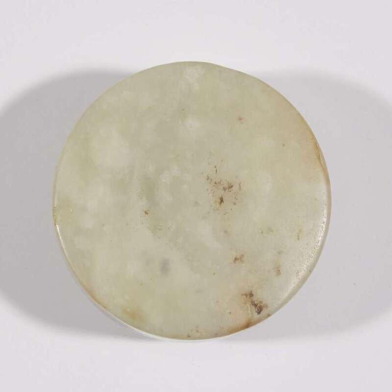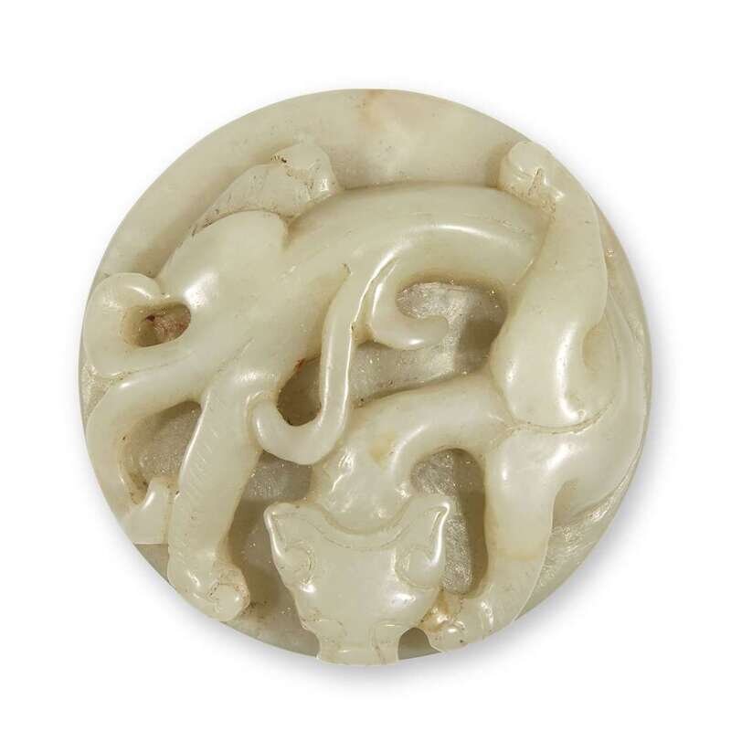 A Chinese pale celadon jade circular "Qilong" scroll weight
