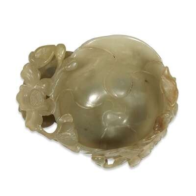 The cup, possibly depicting a magnolia, with open petals, the handle of branch-form with additional peony blossoms and foliage, the stone of grey-green tone with russet and paler inclusions.