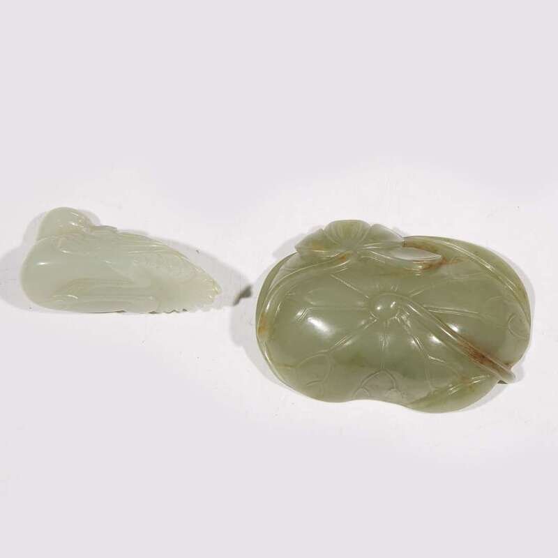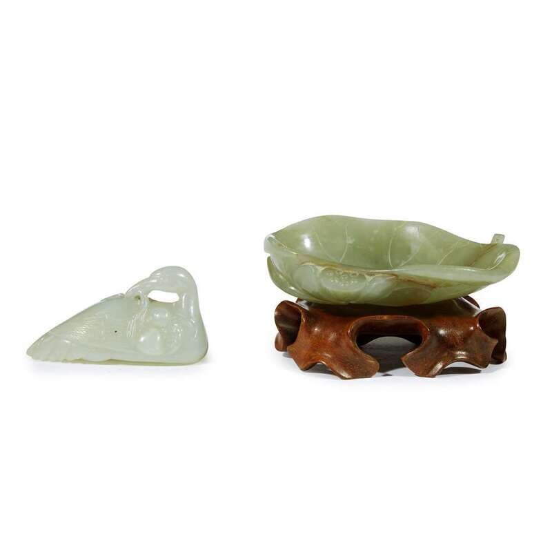 A small Chinese pale celadon jade "Crane" toggle and a small celadon jade lotus leaf dish the crane 18th century