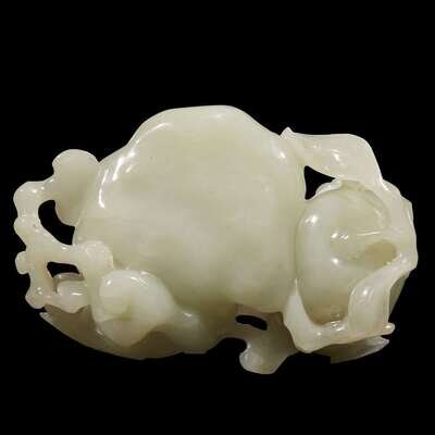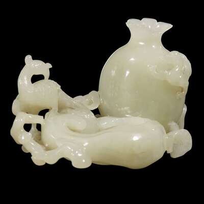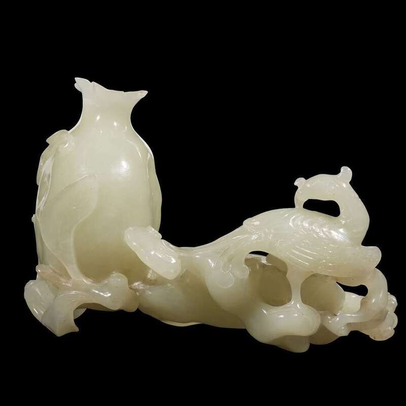 Finely carved and with a high polish, depicting a phoenix on the edge of a ruyi-head form lingzhi coup, a pomegranate to one side with a sinuous qilong to the shoulder, the very even luminous stone with scattered small lighter inclusions and slight pale russet veining.
