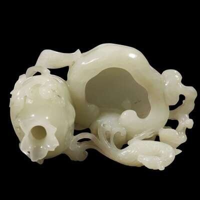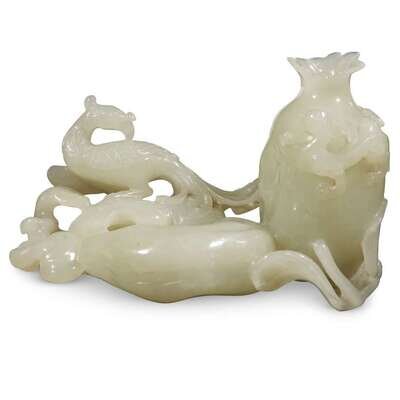A Chinese carved pale celadon jade "Phoenix, Qilong and Pomegranate" brush washer