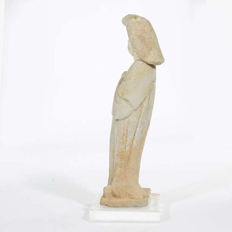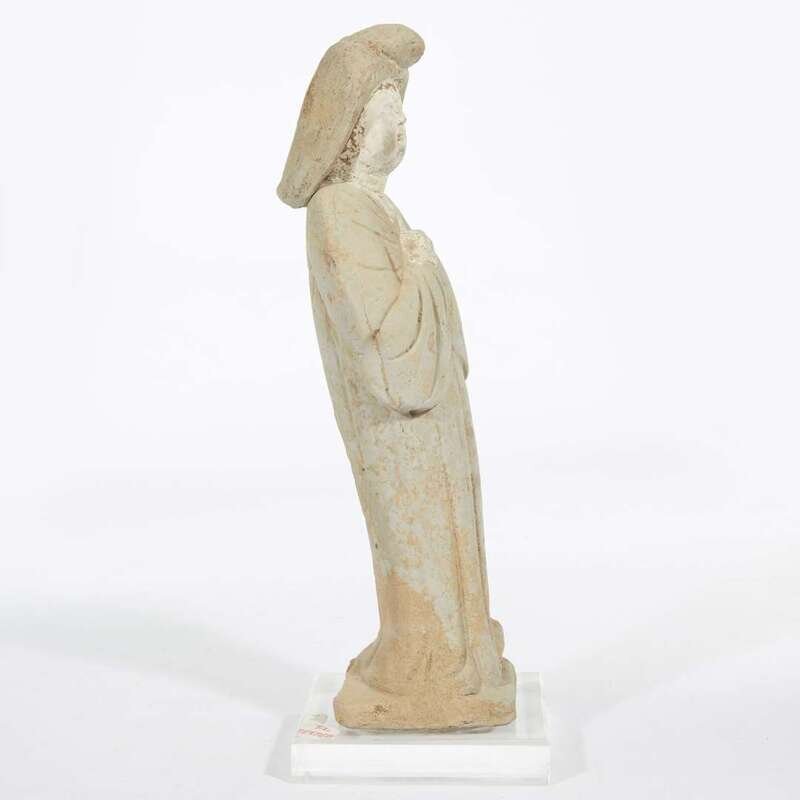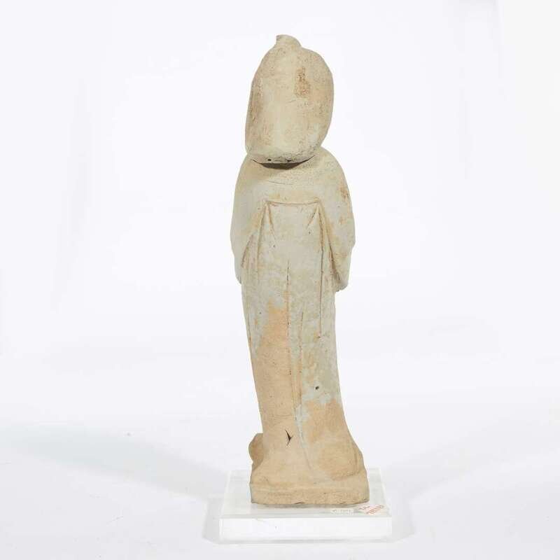 Dressed in a long-sleeved, high-waisted robe that falls in vertical folds to the square base, covering her feet; holding both hands in front of her. Her hair is neatly arranged covering the back of her neck and tied into an extravagant chignon. The results of Oxford Authentication ltd. thermoluminescence test, #C299b71, September 22, 1999, are stated to be consistent with the suggested date of manufacture.