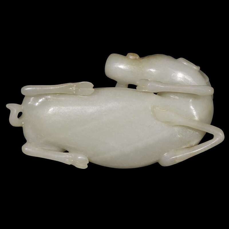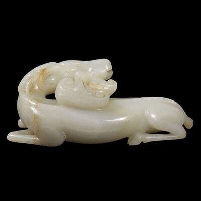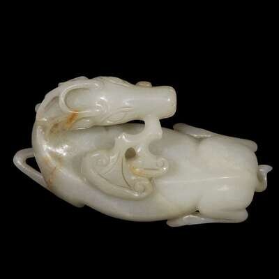The recumbant beast with slender legs and curved neck, bearing a lingzhi spray in its mouth, over its back; the pale grey-white stone with russet inclusions.