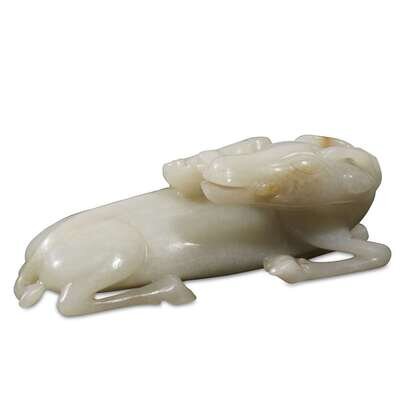 A Chinese carved greyish-white jade "Deer and Lingzhi" group Qing dynasty, 19th century or earlier