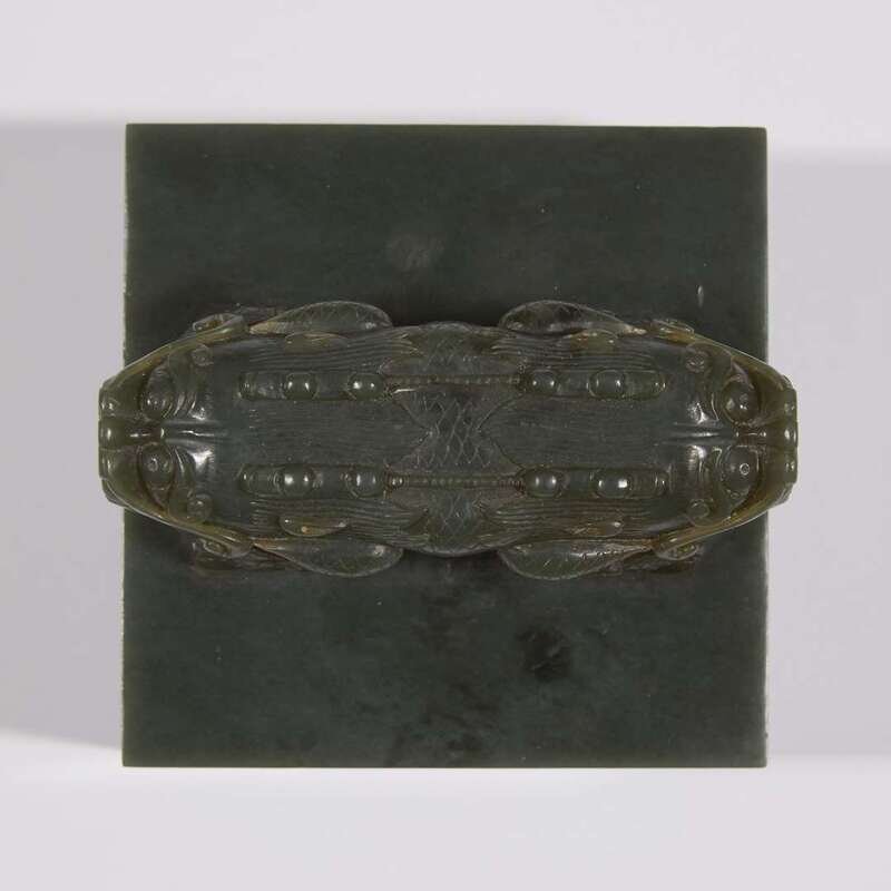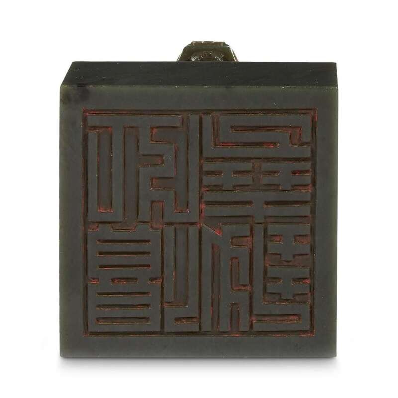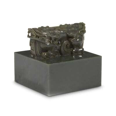 Of large square form, surmounted by intricately carved addorsed dragons, baring their curved fangs, with finely carved and incised scales, mane and horns, a carved aperture to the center of the form, the underside seal face carved in shallow relief with a square four-character seal, reading: "WEI YAO ZE ZHI", which may be translated as "One must stop in front of Yao". The stone of a dense dark sage-green hue with some scattered darker inclusions. NOTE: It has been suggested the present seal relates to an earlier seal of the Kangxi period, used when visiting the Yao temple, but appears to be 19th century in terms of carving and stone used. Both the Guangxu emperor and Empress Dowager Cixi were recorded as having visted the Yao temple, this seal may have been carved for one of them.