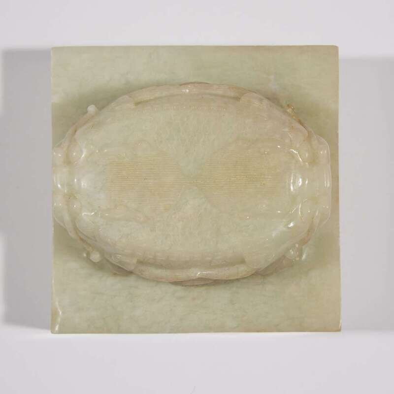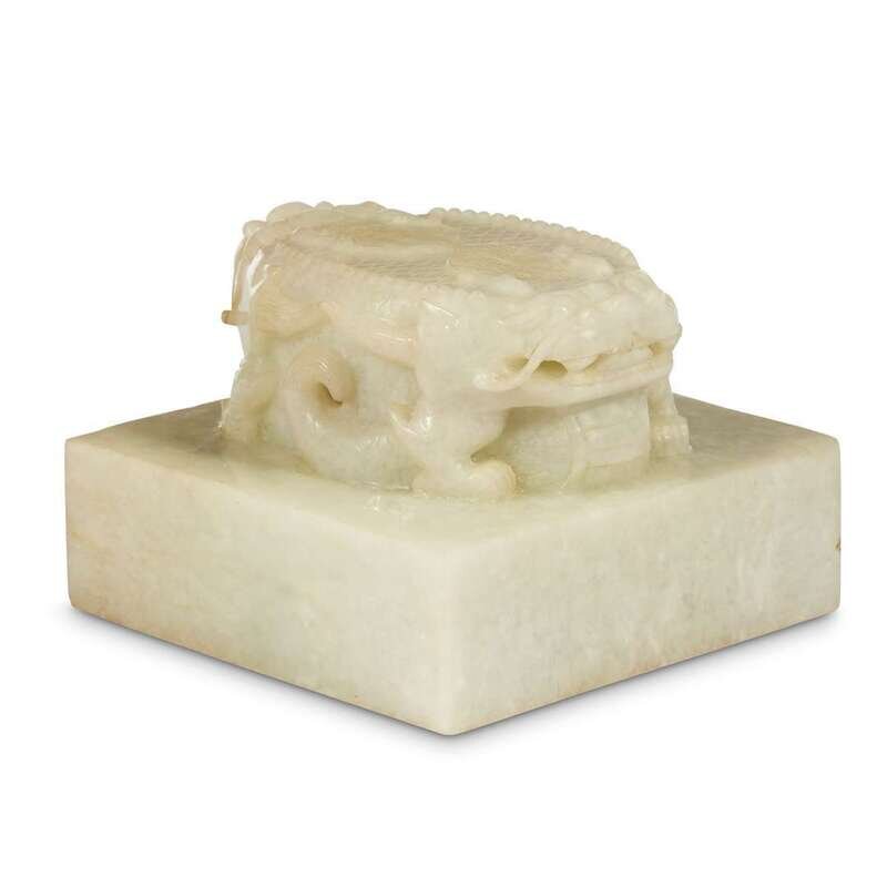 The large square seal surmounted by a pair of finely carved addorsed dragons, with widened stances, carved finely-ridged manes and incised scales, and a curled tail to either side of the cord-aperture, the underside carved in shallow relief with a stylized seal, the stone of a luminous white tone, with fibrous texture comingled with icey pale green.