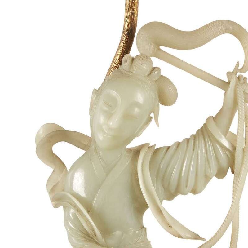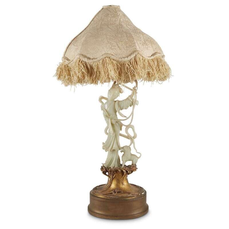 The jade delicately carved with flowing draperies and a fly-whisk, a small lion at the beauty's feet, the stone of very even pale celadon tone, on a carved and gilt wood art nouveau base, together with a shaped silk shade.