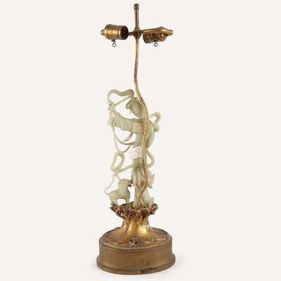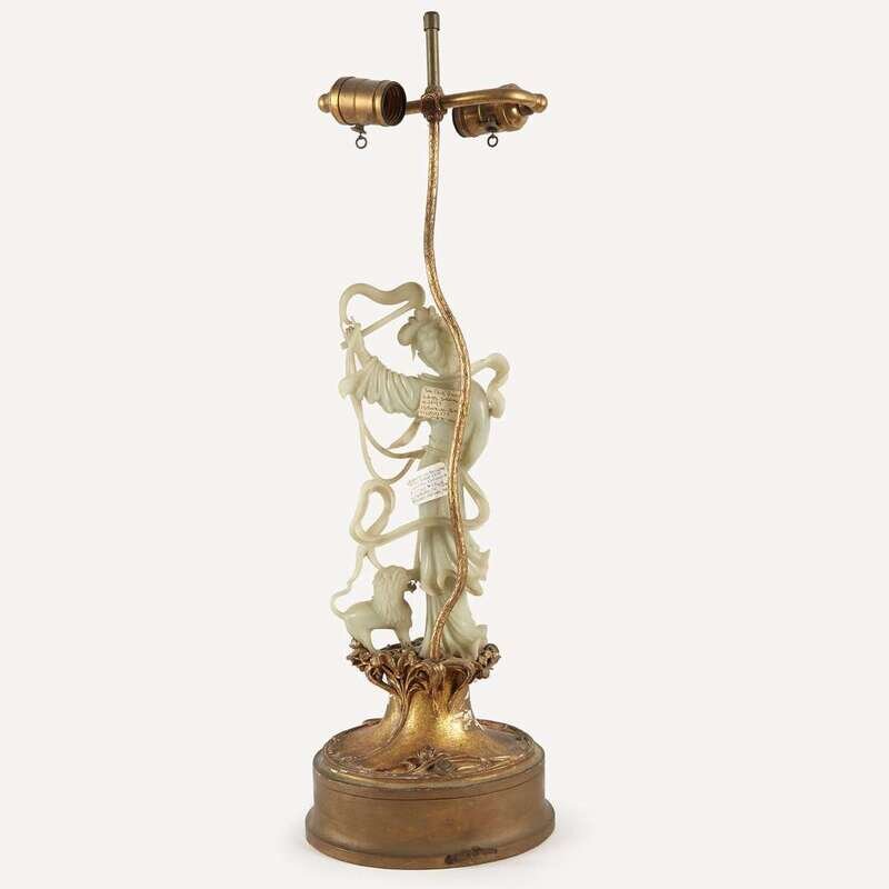 A Chinese carved celadon jade figure of meiren and lion, with lamp mounts attributed to Edward I. Farmer circa 1930 or earlier