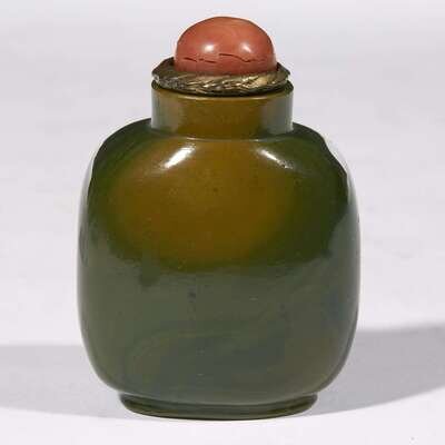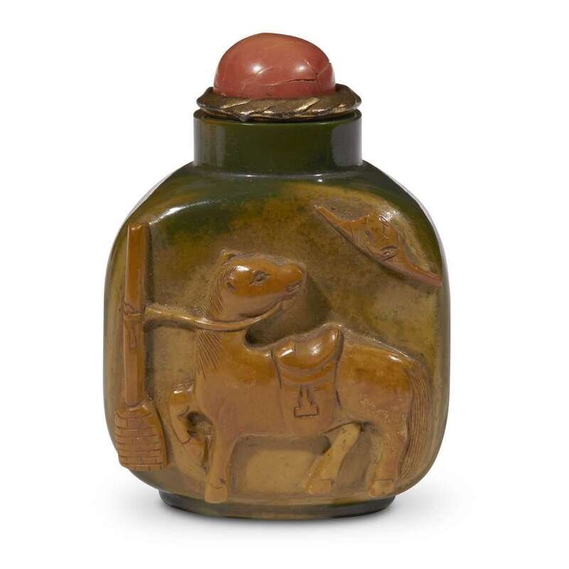A Chinese carved green and brown jasper "Horse and Bat" snuff bottle