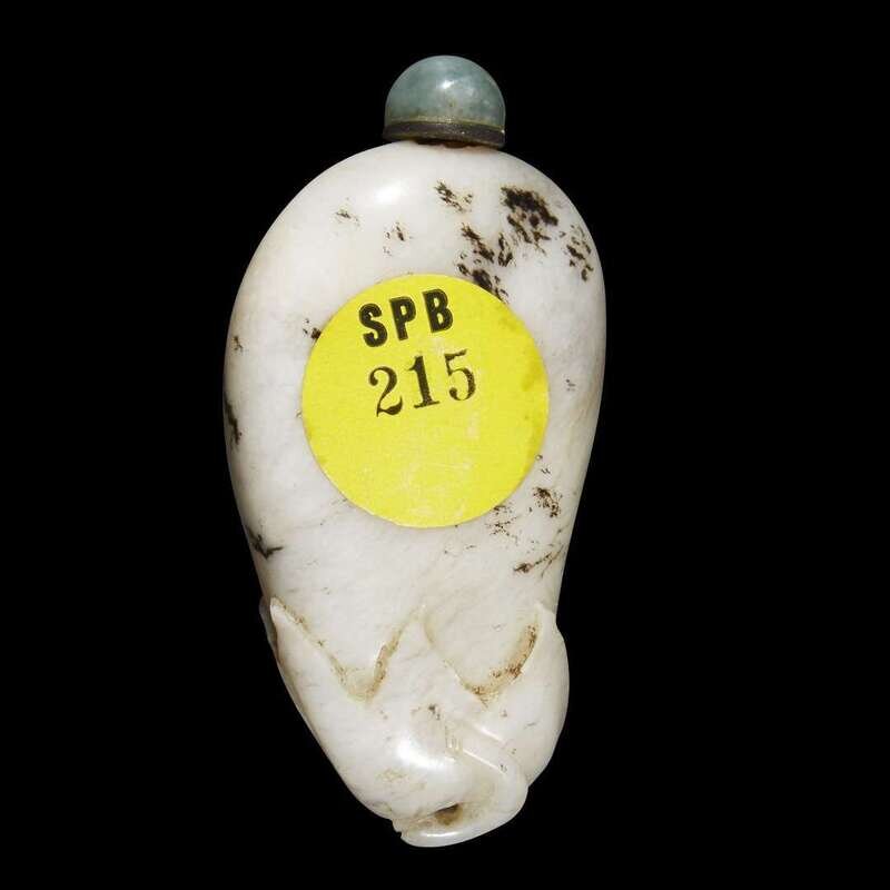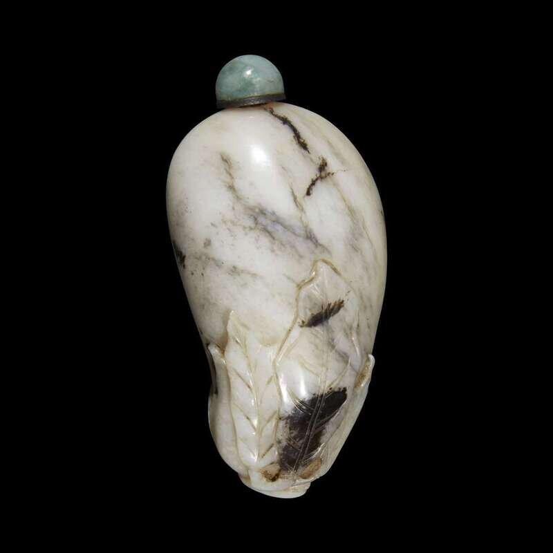 Of pleasing pebble form, with carved corona and two elegantly articulated leaves, a suspension hole under the curled stem, the stone of fairly opaque grey-white with grey and dark black-brown inclusions; a pale green hardstone stopper.