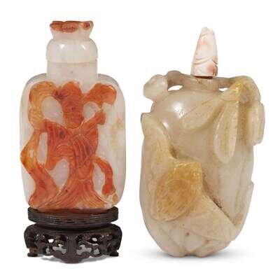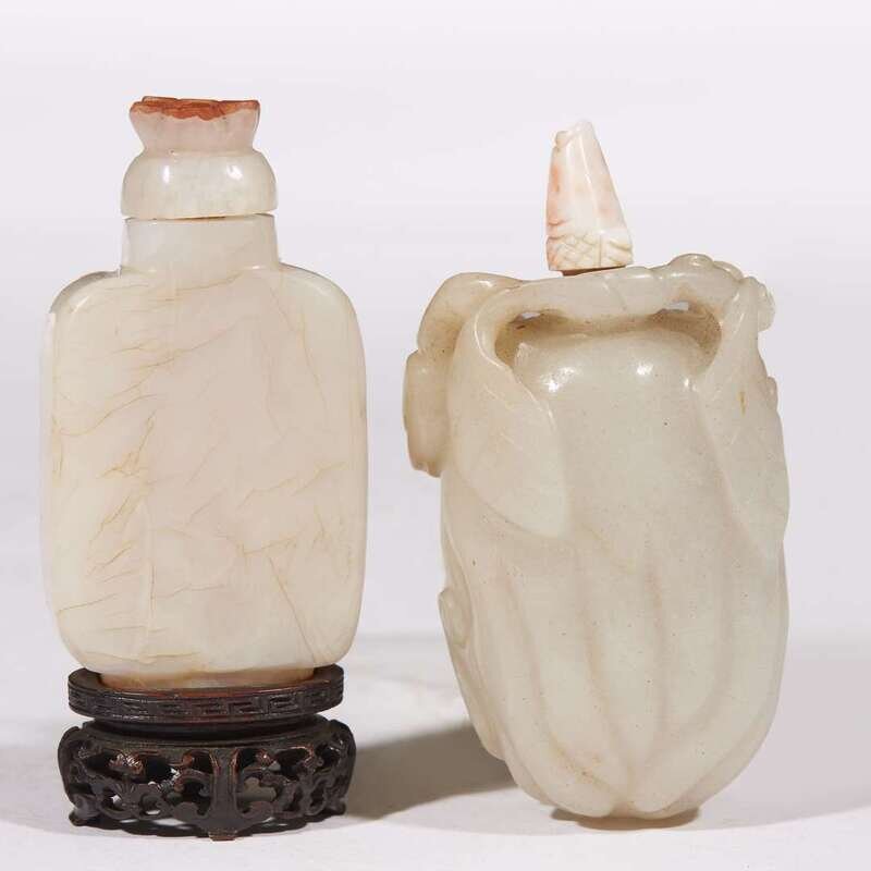 A beige and grey-white jade "Citron and Bat" snuff bottle and a hardstone "Meiren" bottle