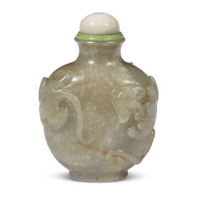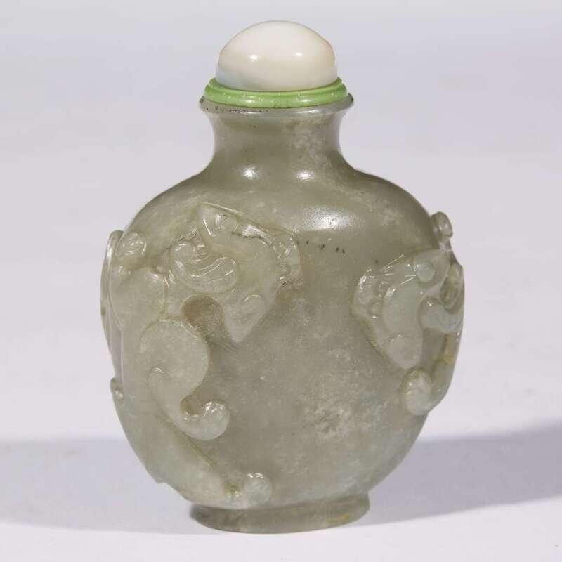 A celadon-grey jade "Three Qilong" snuff bottle