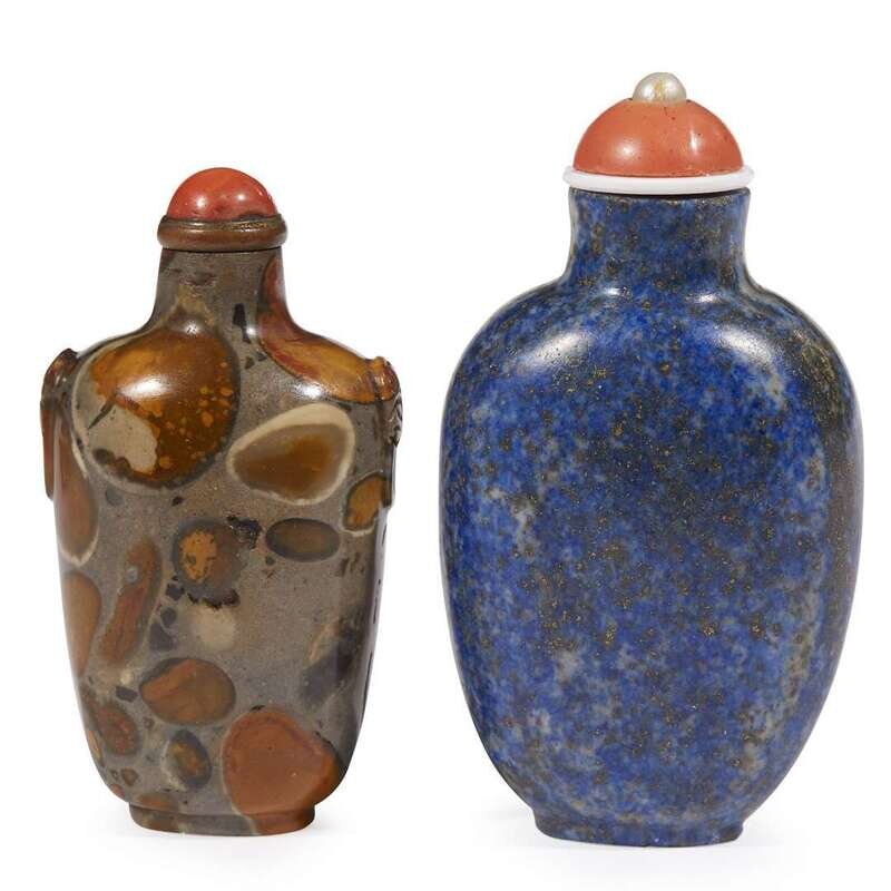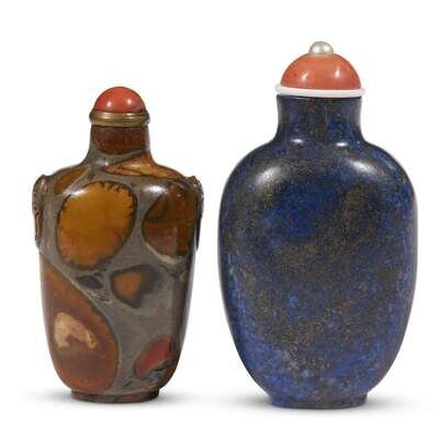 The lapis lazuli snuff bottle of flattened vasiform, with small foot and cylindrical neck, "coral" glass and pearl stopper; the other of slightly flattened vasiform with straight mouth, oval foot, well hollowed, "mask and ring" handles, domed coral stopper on a brown collar.