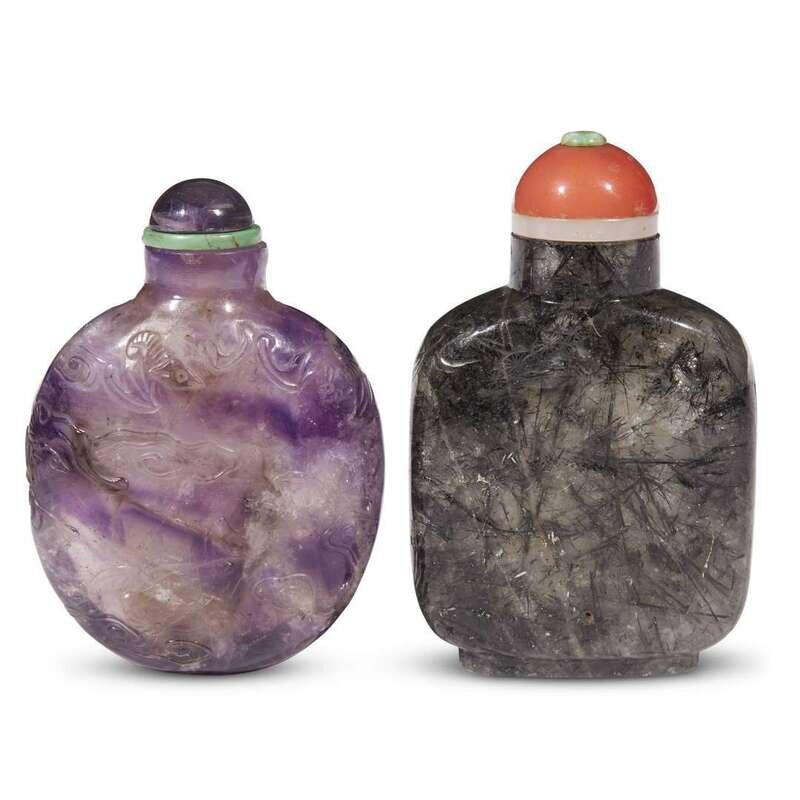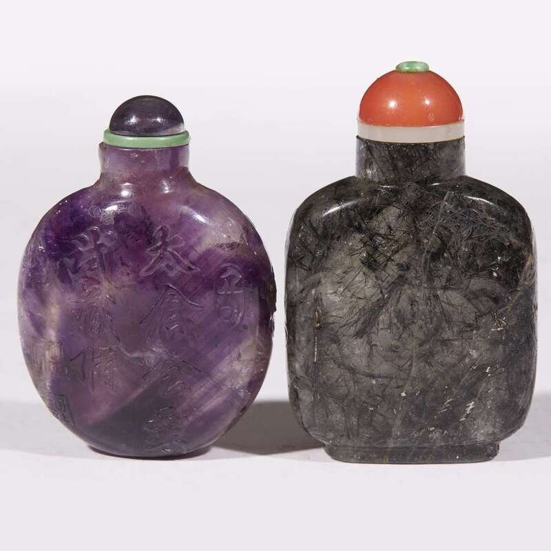The first, amethyst, carved with bats among clouds and inscription to the reverse; the second a grey quartz bottle with black inclusions, finely carved with pine in a landscape.