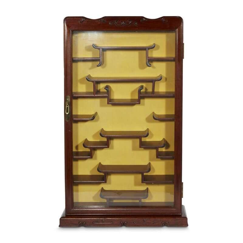 With scroll-carved pediment and base, with glazed door enclosing a series of shaped shelves.