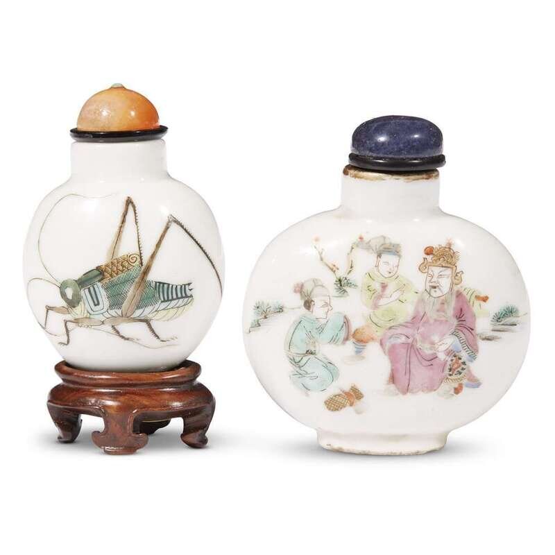 The first of flattened ovoid form, decorated with a meiren with bamboo and plum blossoms, verso painted with an official with two attendants, with a dark hardstone stopper and underside with Tongzhi mark, and probably of the period; the second of ovoid form painted with crickets and an overturned basket, underside with indistinct four-character mark, mounted on a wood stand.