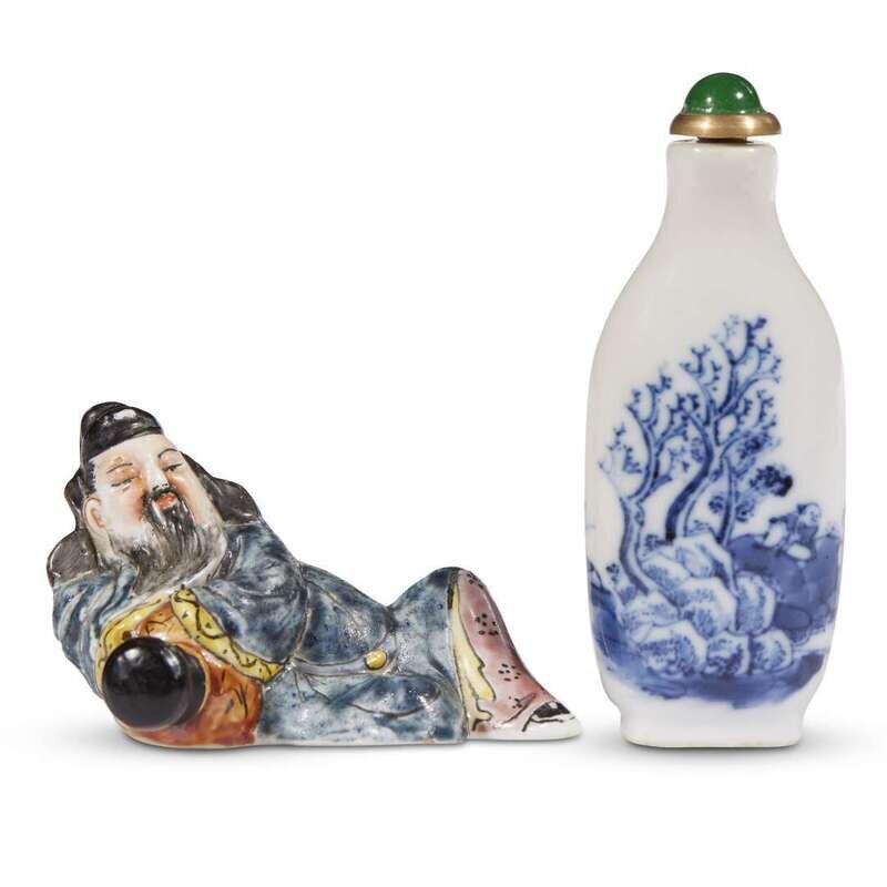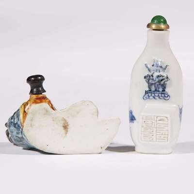 A Chinese molded and enameled porcelain "Libo" snuff bottle and a molded blue and white porcelain snuff bottle
