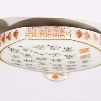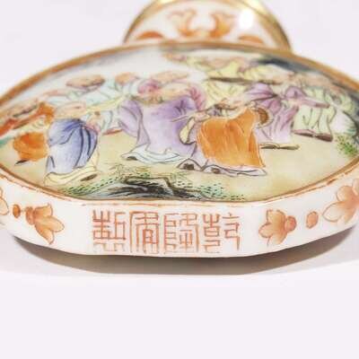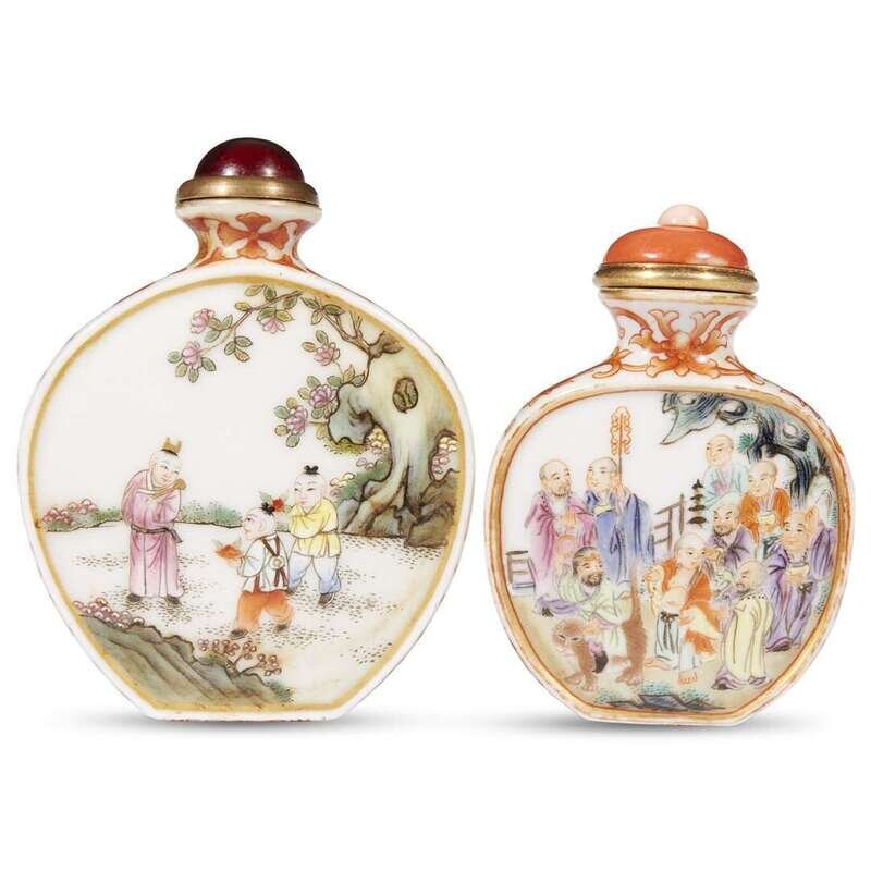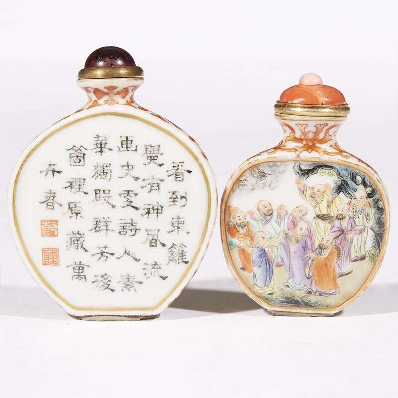 Both of flattened ovoid form, with red painted Qianlong four-character mark to undersides, one decorated with lohan, coral stopper; the other with three boys in a garden, an inscription verso, red glass stopper.