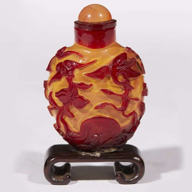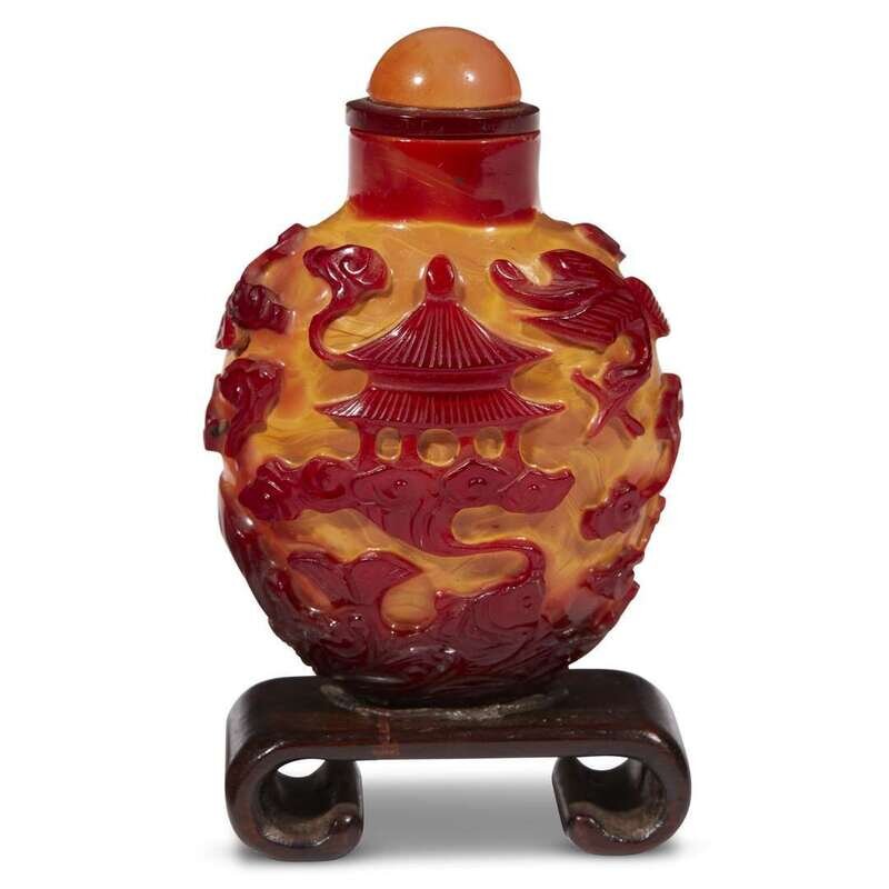 Carved with crane, bat and peaches, a fish with pavillion emerging from a cloud scroll in its mouth.