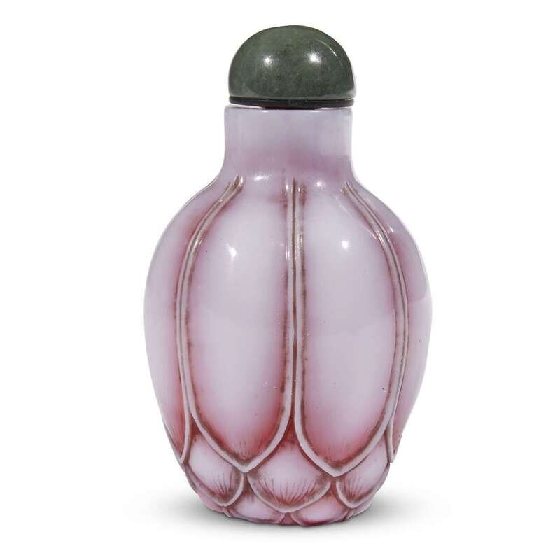 A Chinese carved ruby and pale pink-white overlay "Lotus Bud" snuff bottle