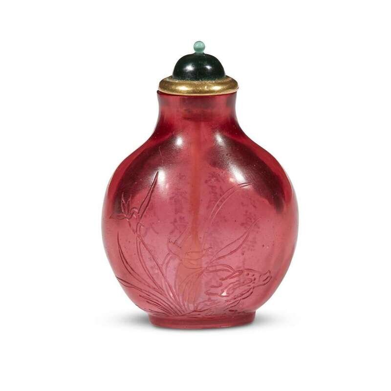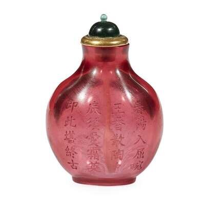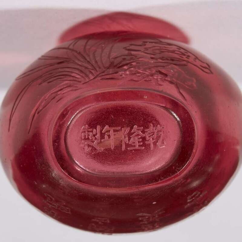 A small Chinese incised ruby glass snuff bottle Qianlong four-character mark